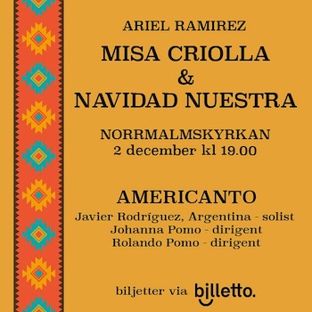 Norrmalmskyrkan, Stockholm Norrtullsgatan 37, StockholmDen argentiske kompositören Ariel Ramirez kör verk MISA CRIOLLA & NAVIDAD NUESTRA framförs av den latinamerikanska kören AMERICANTO, under ledning av Johanna Pomo & Rolando Pomo. Gästsolist JAVIER RODRIGUEZ från […]